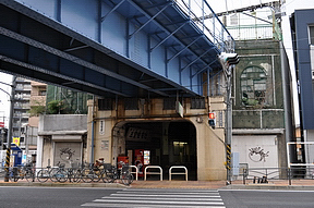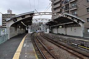 高架にある相対式2面2線の無人駅。かなりきついカーブ上に設置されています。古くくすんだ色のコンクリートがいい味を出しており、昭和の時代から時間が止まったような雰囲気が漂っていました。