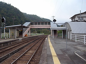 ホームは相対式2面2線。コンクリートの小さな簡易駅舎が建っています。駅周辺の民家は少なめで、山々と深い緑の風景が印象的な駅です。