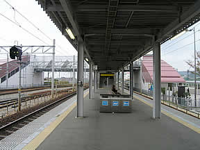 島式1面2線のホームをもつ橋上駅。側線が数本あるので構内は広く見えます。