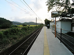ホームは単式1面1線。委託の駅員がいました。洋風の装飾がなされた可愛らしい駅舎が建っています。