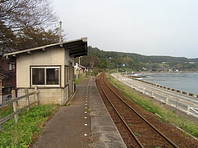 単式1面1線の無人駅。ホームからは、弧を描いた美しい海が望めます。ホームは築堤上にあるので階段を下がって下に降ります。周辺の民家は多め。